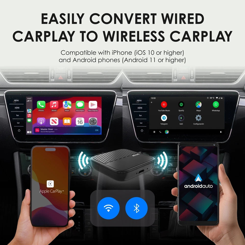 - This adapter is perfect for vehicles with factory-installed wired Apple CarPlay and Android Auto systems, and converting them into wireless connections. Compatible with both iPhone (iOS 10+) and Android (Android 11+), it provides a seamless wireless experience for more convenience and connectivity on the road.
