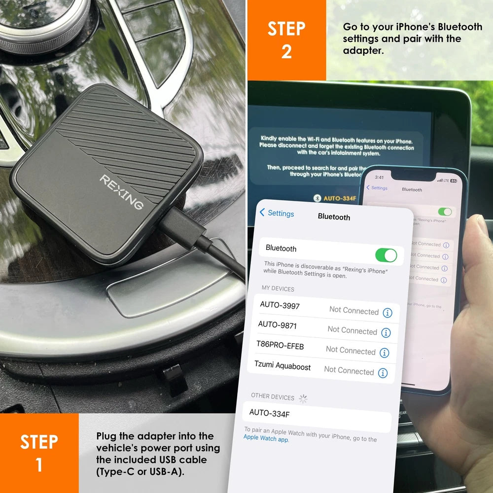 - Set up is simple in just three steps: (1) Plug the adapter into your vehicle's USB or Type-C port. (2) Activate Wi-Fi and Bluetooth on your phone. (3) Pair your device by selecting the adapter from your Bluetooth settings. Future connections are automatic and hassle-free.